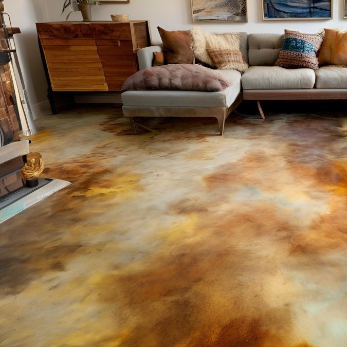 Concrete treated with acid-based or water-based stains to create decorative, coloured effects. This finish adds depth and character, making it popular for restaurants, showrooms, and modern homes.