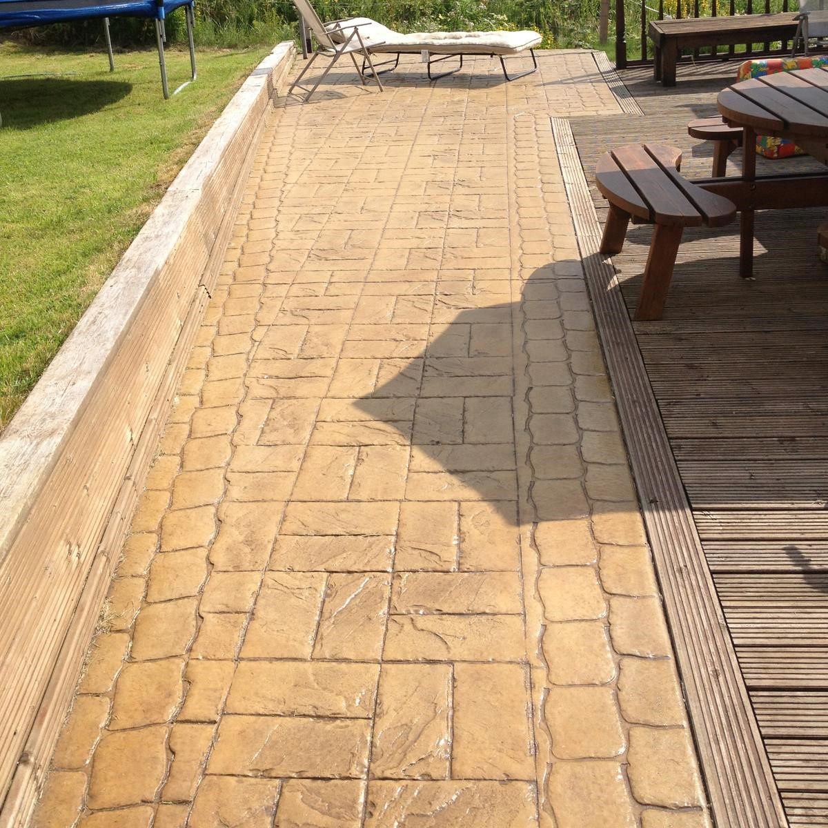 A textured finish that mimics materials like brick, stone, or wood by imprinting patterns into freshly poured concrete. Often used for driveways, patios, and outdoor walkways.